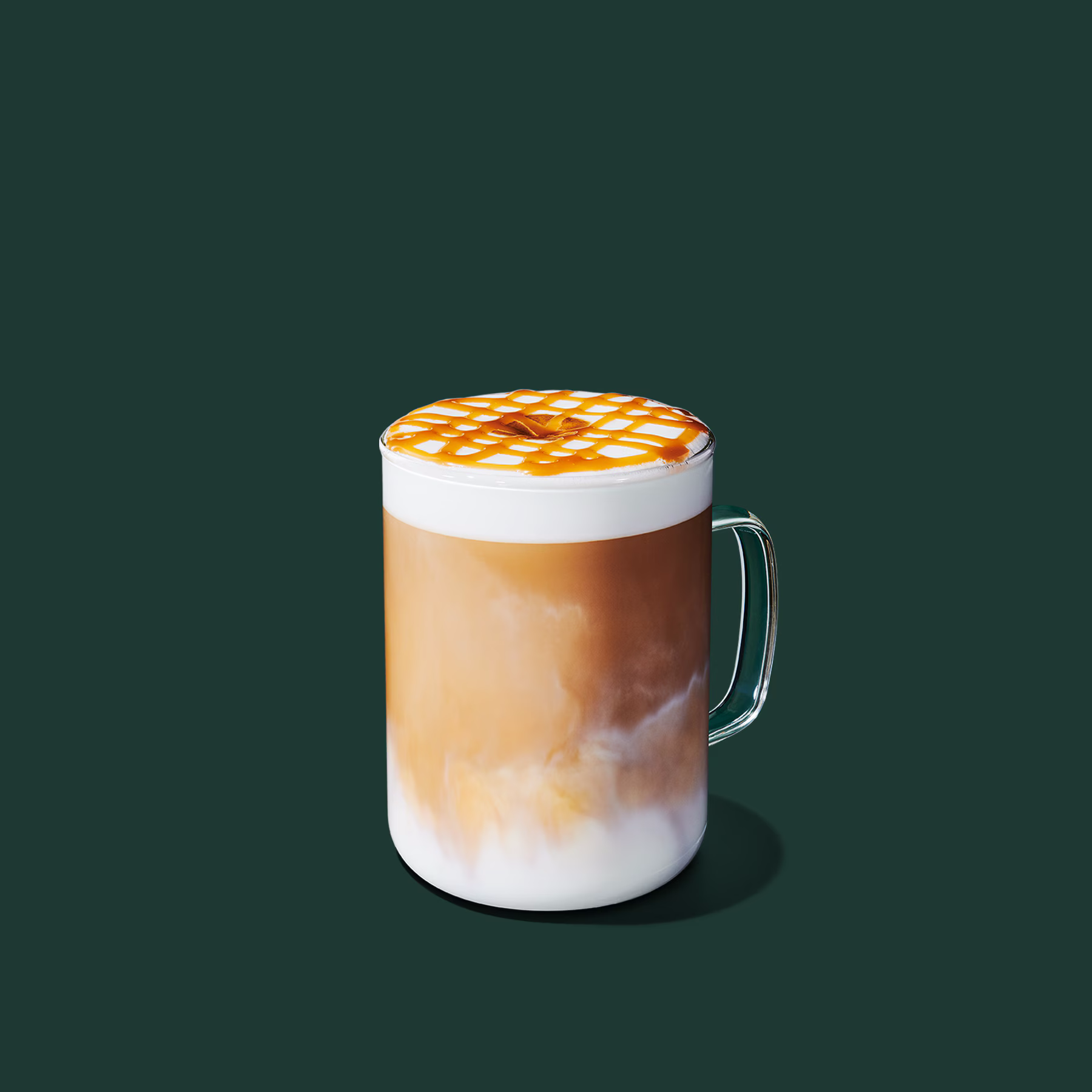 - Top with caramel drizzle, creating the crosshatch, double-circle design.